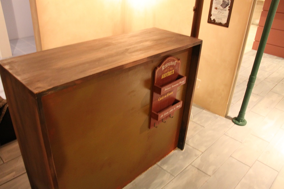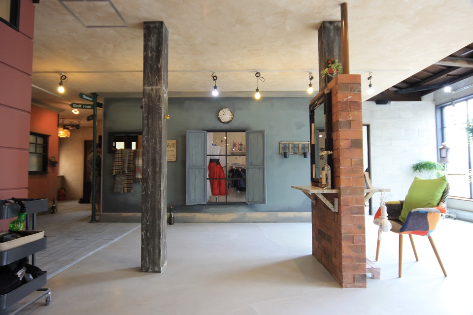 A STORY一級建築事務所 山口様にもデザイン等ご協力頂き、無骨なフロントを木材や塩ビ管にエイジング塗装で造りました!